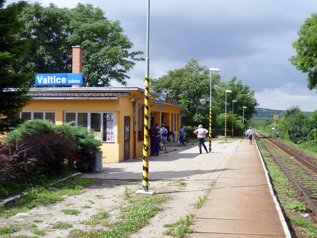 Na železniční trati Břeclav – Znojmo (v jízdním řádu pro cestující označená číslem 246) je i zastávka Valtice město. Nachází se pár metrů za přejezdem na silnici spojující Vlatice a Lednici. Trať vede z Břeclavi přes Boří les, Valtice, Mikulov na Moravě, Hrušovany nad Jevišovkou do Znojma. Jednokolejná celostátní trať, historicky vznikla ze dvou odboček z hlavní trati c. k. privilegované společnosti Státní dráhy Vídeň-Hrušovany n. J. – Střelice (Brno). Blíže viz např. ZDE