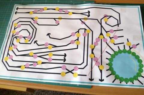 Z pracovních důvodů jsem pod matice vložil i předlohu, na které jsou vyznačené trasy kolejí a jiné důležité informace. Až bude všechno odzkoušené, finální desku pro tlačítka a další ovládací prvky zřejmě zhotovím vypálením na laseru (spoléhám na přislíbenou pomoc kamarádů).