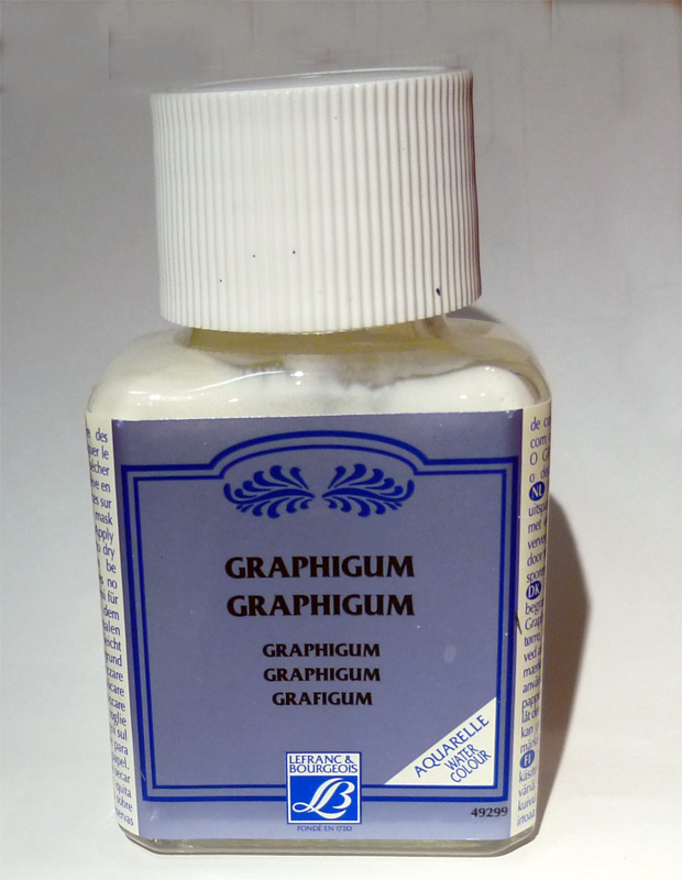 V jednom větším pražském obchodě pro výtvarníky jsem objevil pod označením „krycí kapalina“ tekutinu označenou jako Graphigum. Vyrábí se ve Francii. Tento výrobek je nabízen v našich i zahraničních e-shopech s tímto zbožím. Bílá kapalina ve skleničce o objemu 75 ml stojí okolo stovky, za cenu těsně nad 4 € ji lze koupit v zahraničních e-shopech. To znamená, že 10 ml přijde na 12 – 14 Kč.