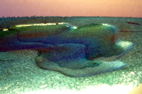Třetí den jsem standardním postupem namíchal přiměřené množství Křišťálové pryskyřice (dále jen „KP“) a rozlil ji do jezérek – jednoho bez aplikace Aquastop a dvou s touto aplikací. Musím dodat, že KP už mám doma více jak rok, takže její hustota je větší, než když je nová. Tudíž i po smíchání měla hustou konzistenci, asi jako med než zkrystalizuje. To možná ovlivnilo výsledky testu. Nicméně, už při nalévání KP bylo patrné, že v jezérkách ošetřených Aquastop se jí moc nechtělo rozlévat. Měla tendenci vytvářet okraj, jako když se rozlévá čokoláda po korpusu dortu. A já věděl, že nápad funguje.