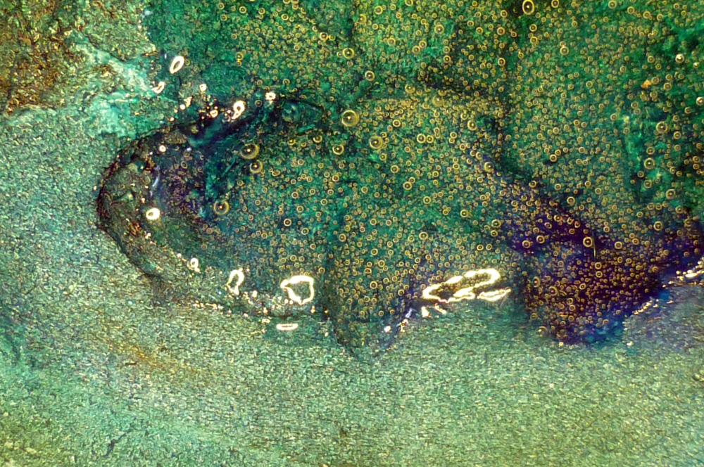 Obr. 2, 3 – Křišťálová pryskyřice nalitá do jezérka ošetřeného Aquastop (bublinky uvnitř pryskyřice na makrofotografii nejsou způsobené chemickou reakcí s Aquastop, ale byly zřejmě do pryskyřice zaneseny nevhodným (rychlým) mícháním