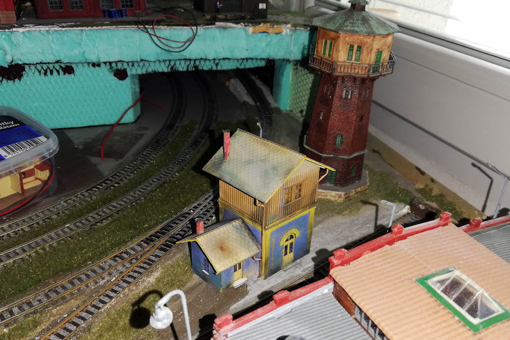 Obr. 10 – Dočasně umístěná Vodárna Protivec v kolejišti (pro srovnání s vodárnou od Fallera)